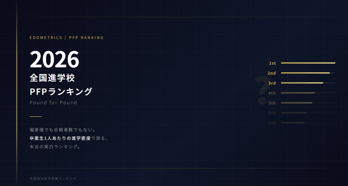 PFP(パウンド・フォー・パウンド)スコアは、卒業生1人あたりの進学密度を独自の計算式で数値化した指標です。東大・京大・医学部などの合格者数を単純に集計するのではなく、各大学・学部の希少性と難易度に応じた重み付けを行い、卒業生規模を補正した上でスコアを算出しています。