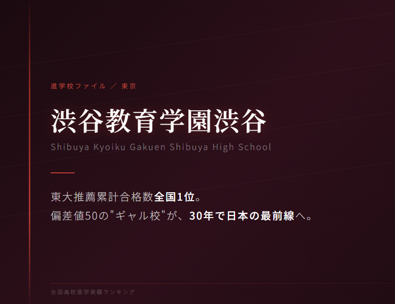 1996年の変革から2025年まで、およそ30年。渋渋の軌跡は、一つの学校が「設計」によって根本から変わりうることを示している。偏差値は50から76へ。PFPランキングは全国12位。桜蔭を超える進学力。海外大への進学ルート。そのすべてが、創立時には存在しなかったものだ。